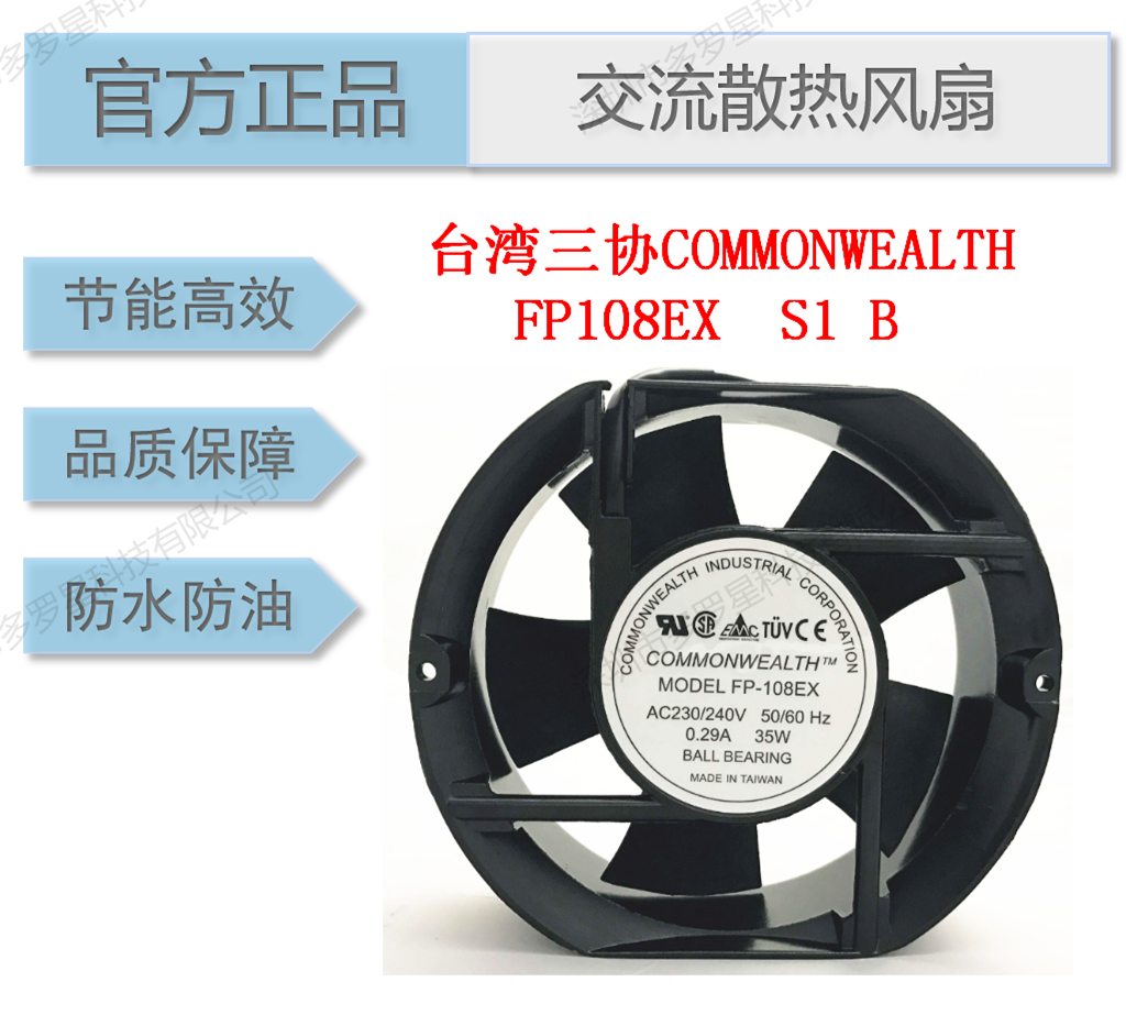 以FP108EX-S1-B風扇為例:正品臺灣三協的英文名稱是“COMMONWEALTH”,型號“FP-108EX-S1-B”,型號都是